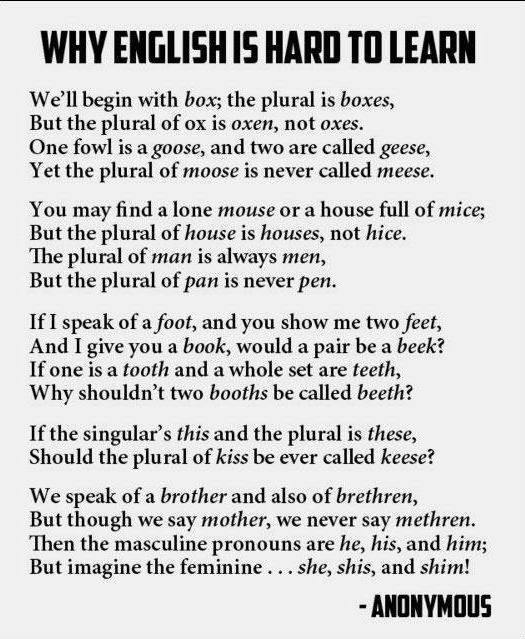 I realise that English is so difficult to learn because so much of it doesn't make sense. It looks like we're breaking language rules all the time, and don't get me started on pronunciation!
